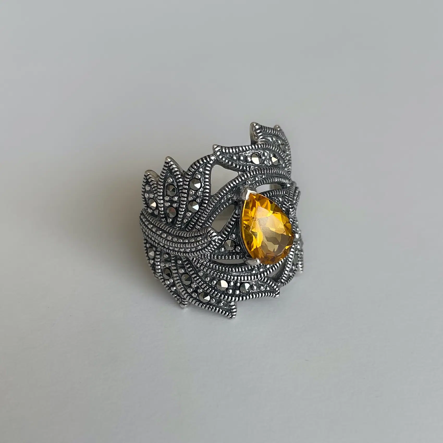 Bague art déco en argent ornée de citrine et de marcassites