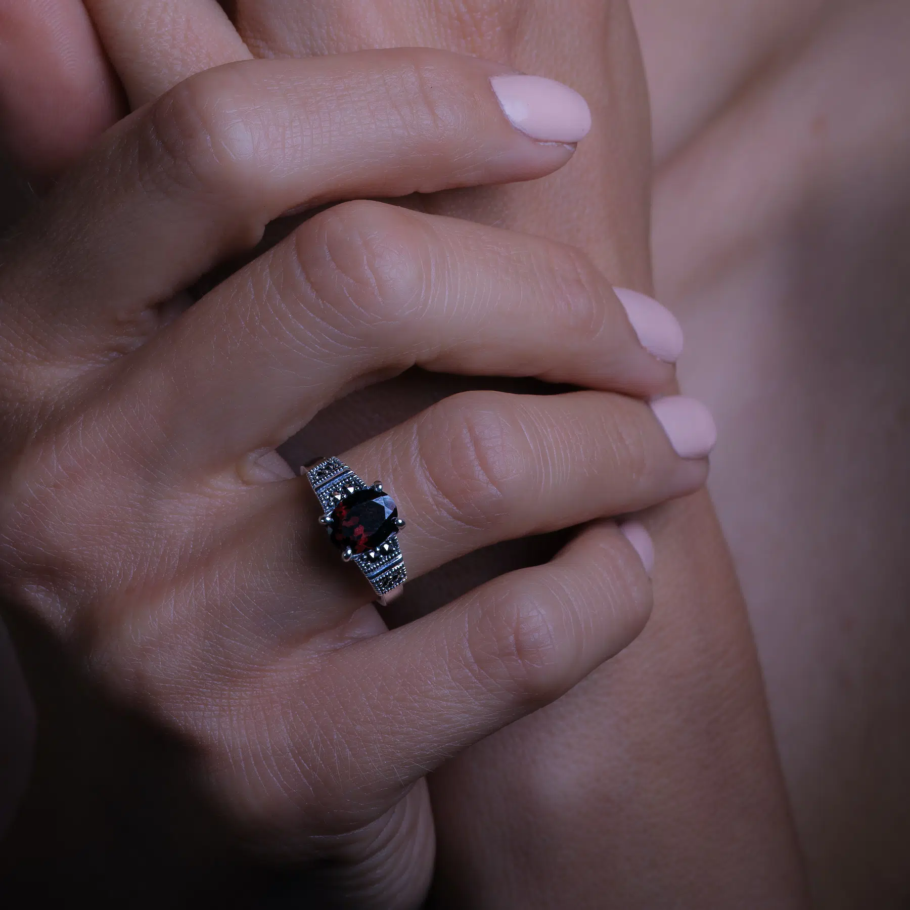 La couleur exceptionnelle de cette bague art deco est due à sa forte teneur en oxyde de fer : plus sa composition contient du fer, plus sa couleur est intense. La magie du grenat atteint son paroxysme lorsqu'elle est associée à la fraîcheur, la brillance et à la pureté de l'or rose 18k ou de l’argent 925. Si vous souhaitez opter pour une couleur hors du commun et une bague solitaire argent, cette bague est faite pour vos doigts. Cette délicate bague de style ancien est faite en argent 925, ce qui fait d’elle un bijou art déco hypoallergénique.