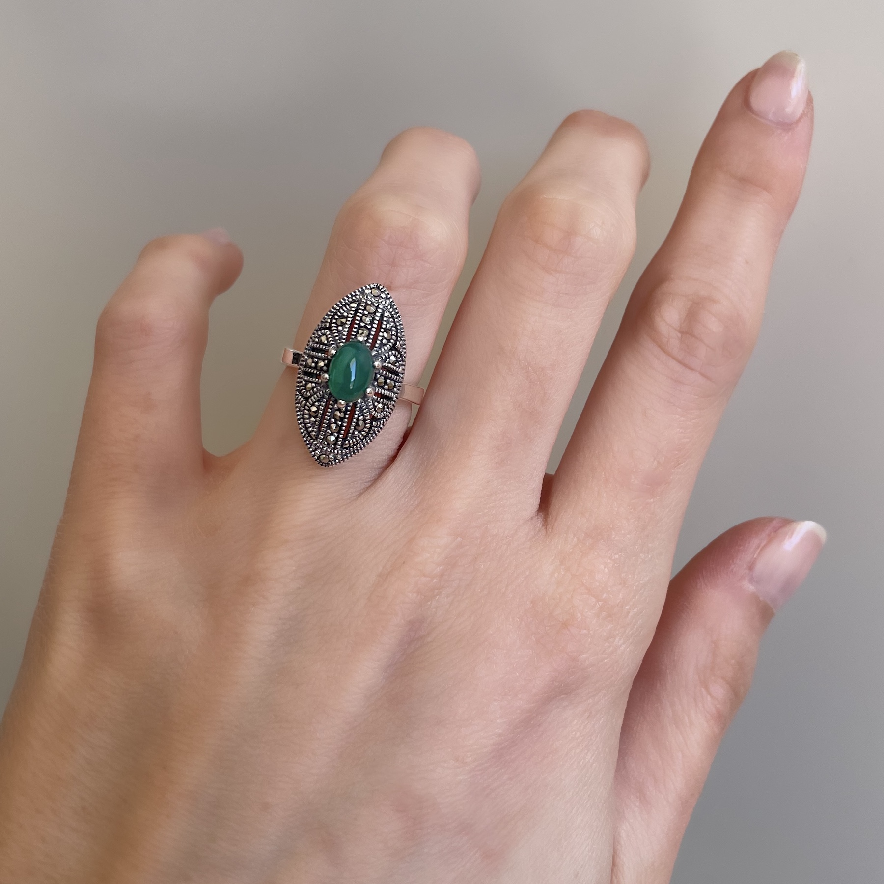 La bague art déco Orélia en argent présente un motif marquise finement travaillé. Ce bijou est serti de marcassites qui dessinent des lignes géométriques inspirées du style des années 1920-1930. Au centre repose une agate verte qui attire immédiatement le regard avec sa teinte intense et légèrement translucide. Cette bague art déco associe lignes graphiques, texture vintage et présence marquée au doigt. En lithothérapie, l’agate verte est associée à l’équilibre émotionnel, à l’apaisement et à l’harmonie intérieure.