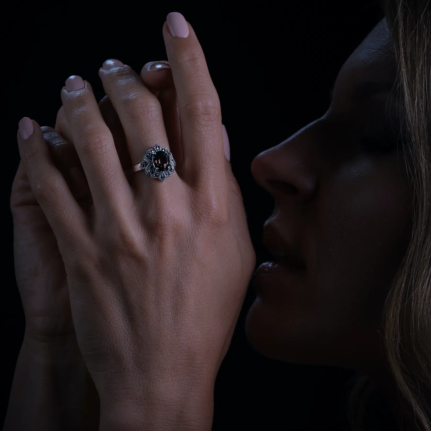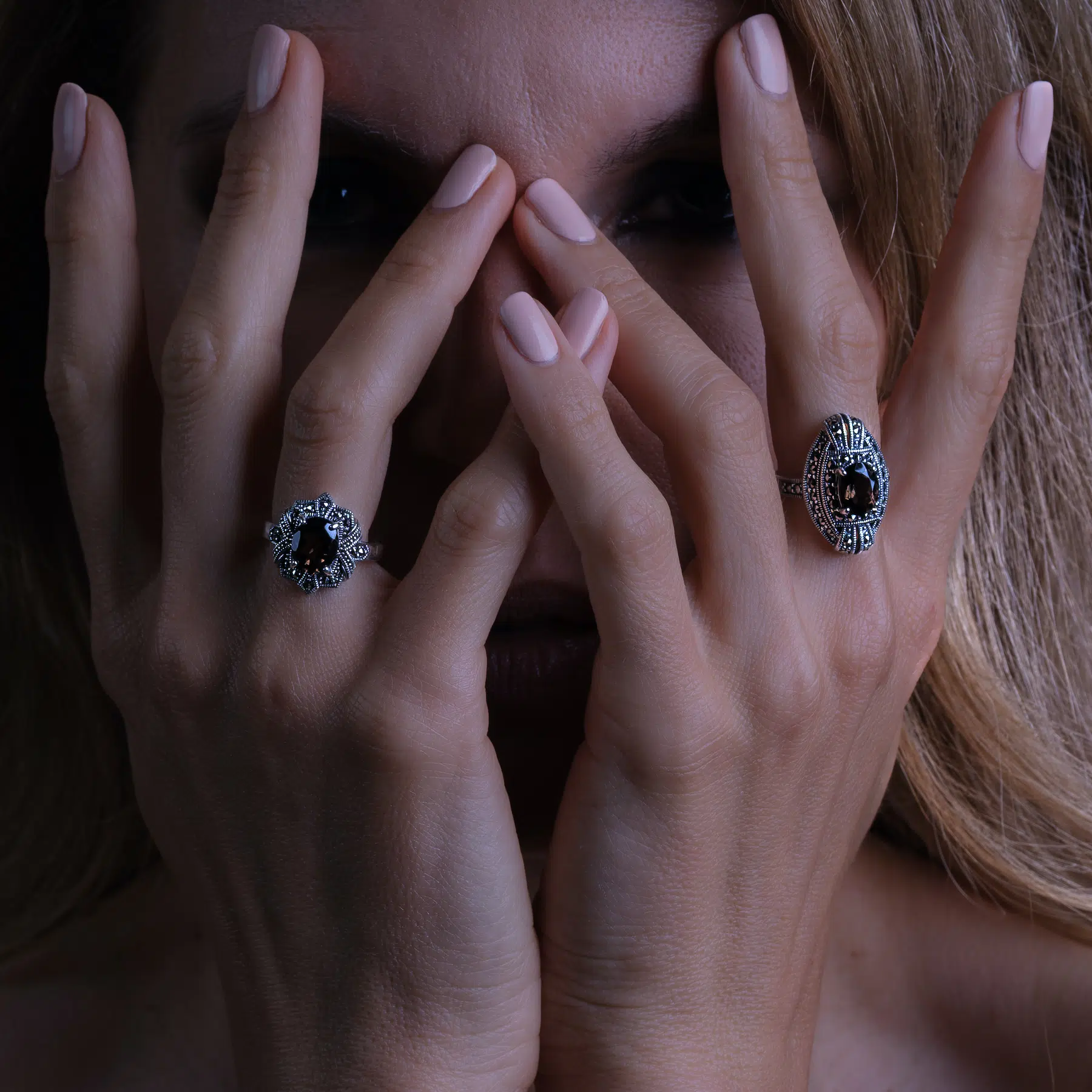 Plongez dans l’élégance intemporelle de cette bague art déco en argent sterling. Son design géométrique captivant met en valeur un somptueux quartz fumé naturel, entouré de délicates marcassites. Le quartz fumé, reconnu pour ses vertus apaisantes et protectrices, s’harmonise parfaitement avec le style des années 1920. Ce bijou incarne l’esprit du mouvement Art Déco avec ses lignes affimées et ses détails complexes, pour ajouter une touche vintage à votre tenue.
