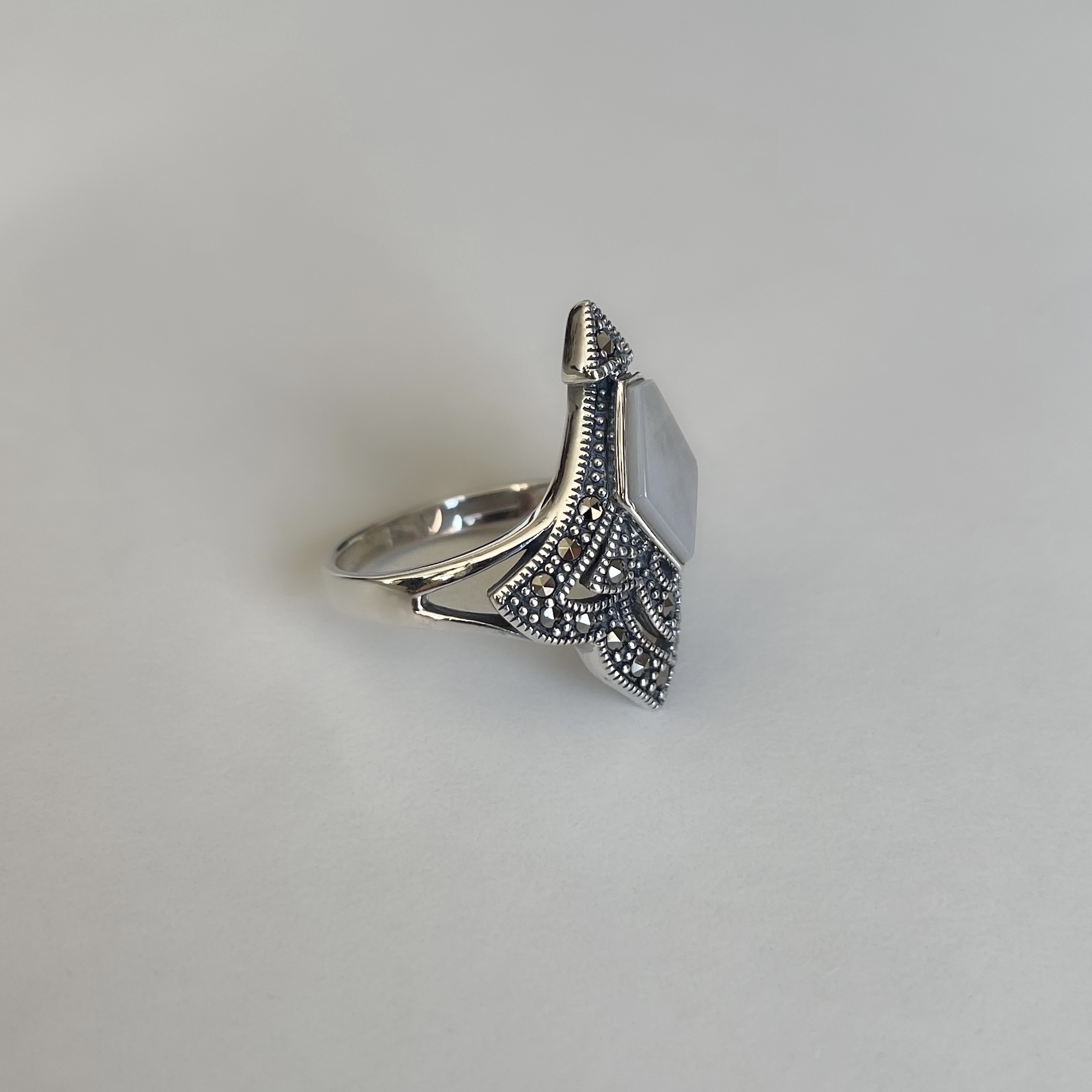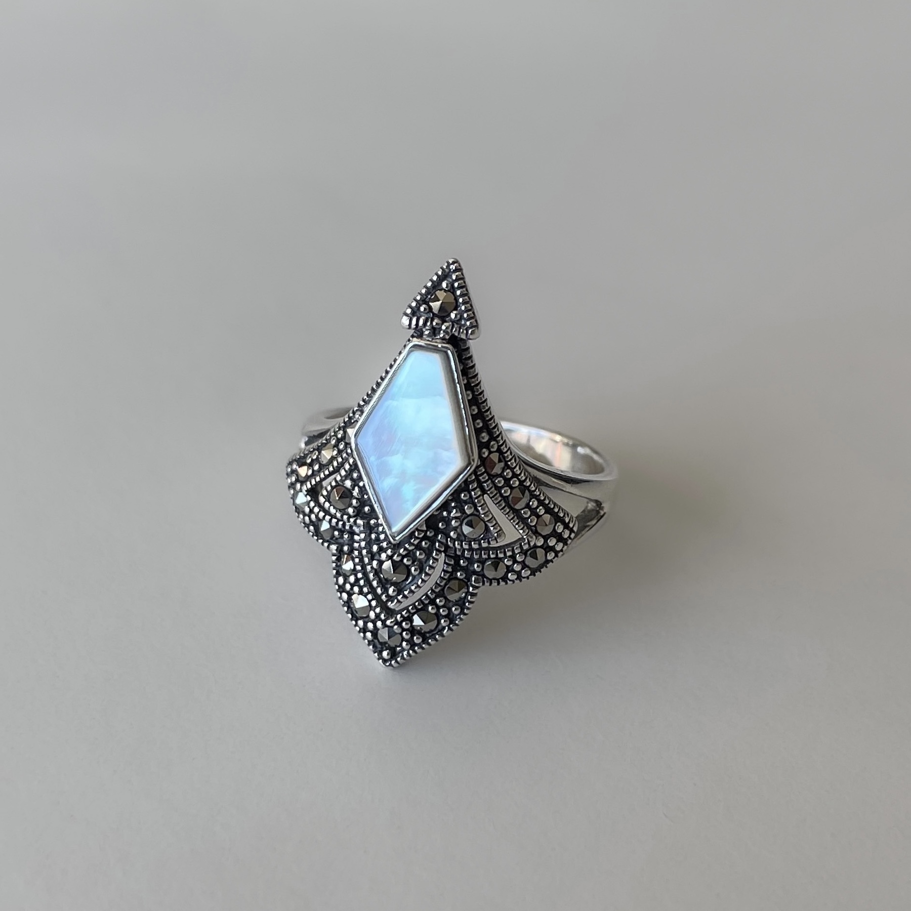 La bague nacre Isolde en argent sterling reprend les codes forts du style Art Déco. Elle offre une structure géométrique marquée et un travail de détails précis. Au centre, une nacre blanche dévoile des reflets fascinants aux nuances douces. Autour, les marcassites soulignent le motif avec un décor ajouré et symétrique, typique des bijoux d’inspiration ancienne. Le contraste entre l’argent, la nacre et les marcassites apporte du relief et de la profondeur. Cette bague art déco séduit les amateurs de bijoux vintage, de lignes graphiques et de pierres naturelles au charme authentique.