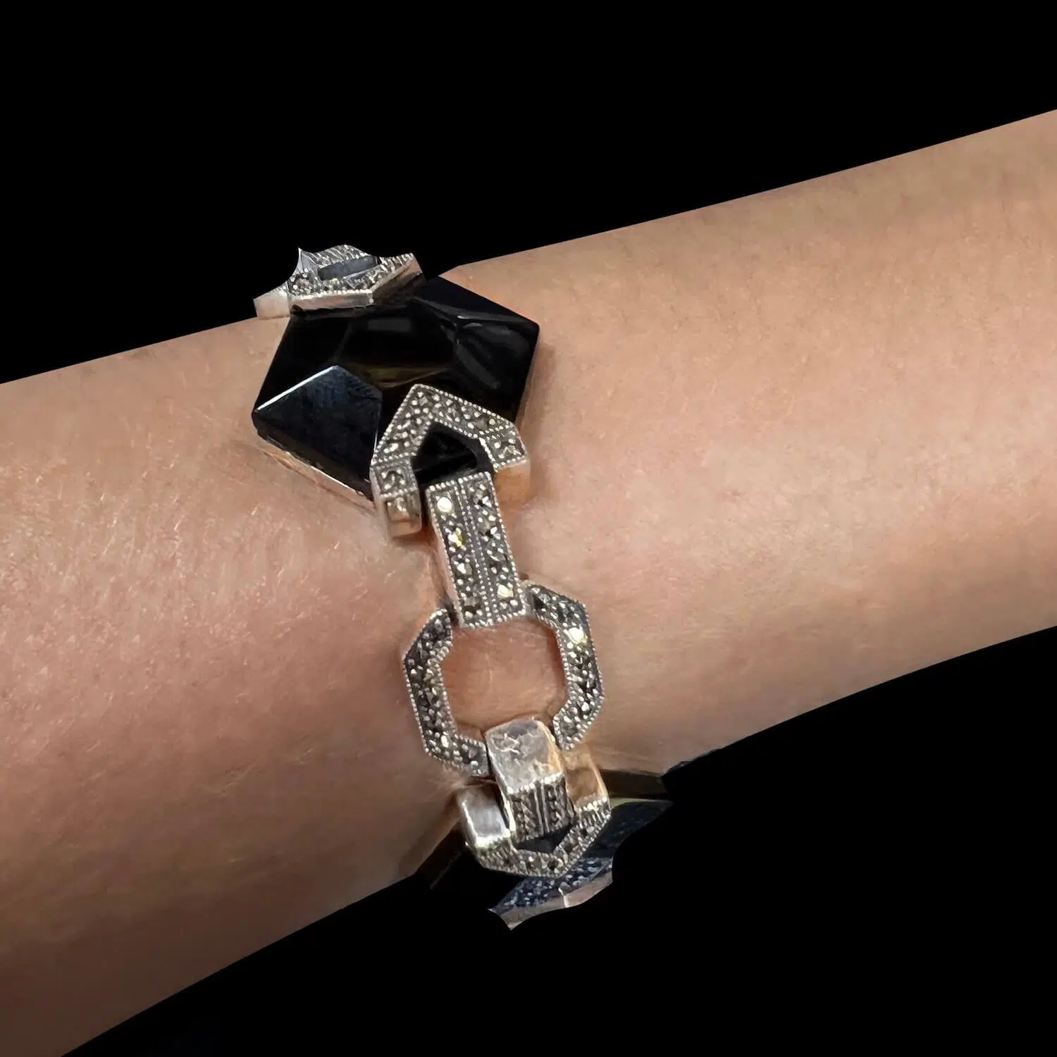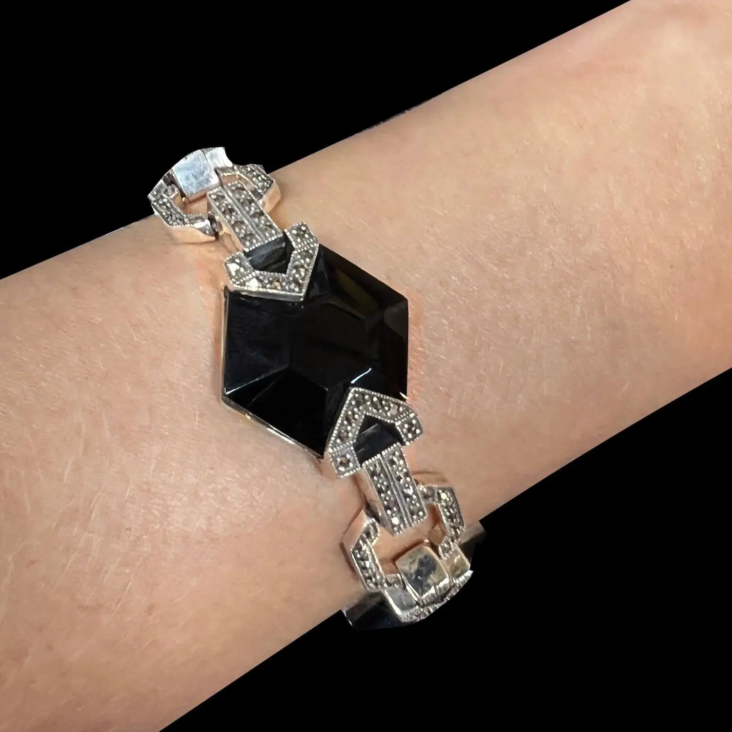 You'll fall under the spell of this sophisticated, feminine art deco onyx bracelet. You'll love its unconventional design and geometric shapes reminiscent of the jewelry of the Roaring Twenties.