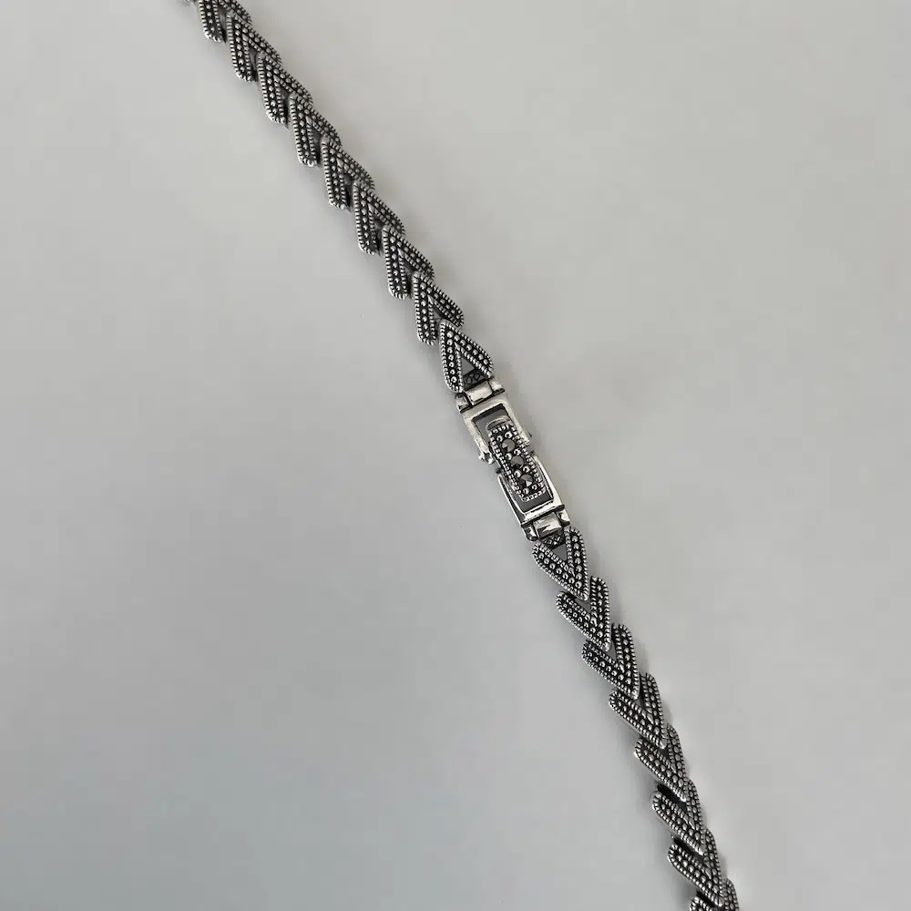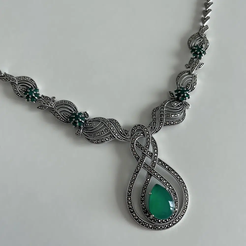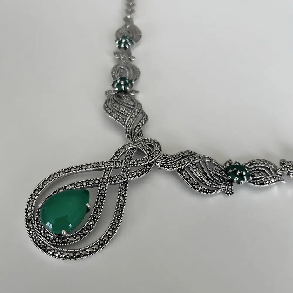 Discover our sumptuous art deco necklace, a masterpiece designed in genuine silver, adorned with a fascinating green agate. It is perfectly enhanced by delicate marcasites. A perfect blend of refinement and character, this jewel is a tribute to the Art Deco era. Green agate, a stone of balance and harmony, brings a touch of serenity and well-being to the wearer. This necklace is not just an accessory, it's a promise of distinction and natural virtues.